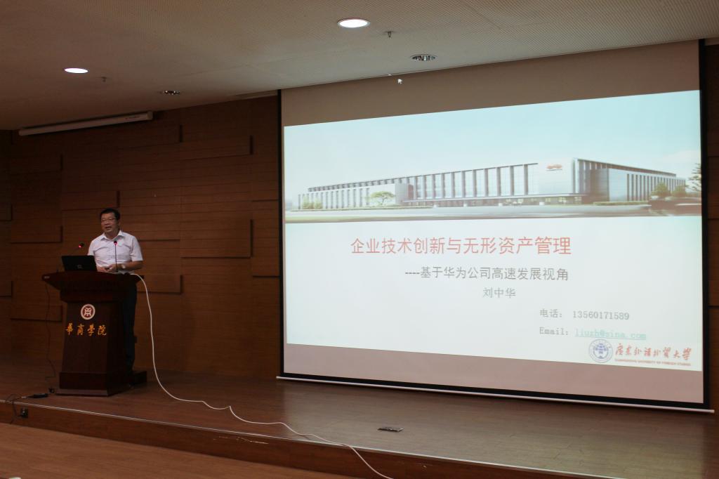 10月19日下午3点,广东外语外贸大学太阳成集团tyc151cc院长刘中华教授应邀来校,在图书馆报告厅为我校太阳成集团tyc151cc师生作了一场题为“企业技术创新与无形资产管理——基于华为公司高速发展视角”的学术讲座。华商太阳成集团tyc151cc院长马玉珍教授主持讲座,并对刘中华教授作了详细介绍。